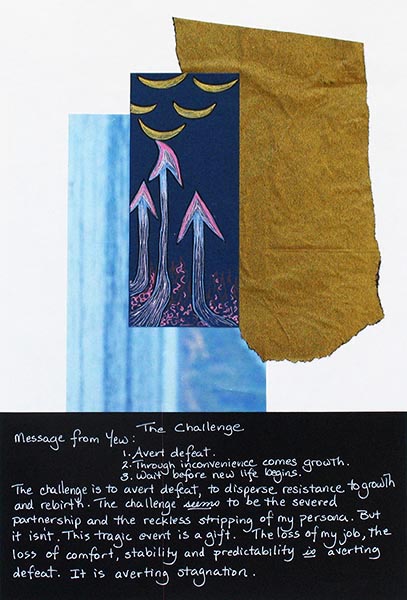 The challenge comes in order to avert defeat – in order to disperse resistance to growth and rebirth. The challenge appears to be a reckless stripping of my persona. But it isn’t. This tragic event is a gift. The loss of my job, the loss of comfort, stability, and predictability is the defense I need against stagnation.
